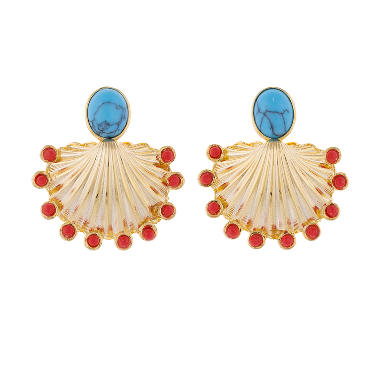 | Scallop Earring Deniz kabuğu formlu doğal turkuaz ve mercan taşlı küpe |